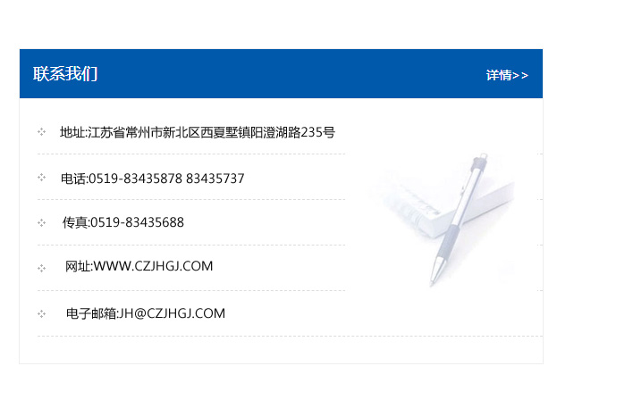 傳真:0519-83435688    郵編:213135    網址:WWW.czjhgj_com.chinnzo.com    電子郵箱:JH@czjhgj_com.chinnzo.com